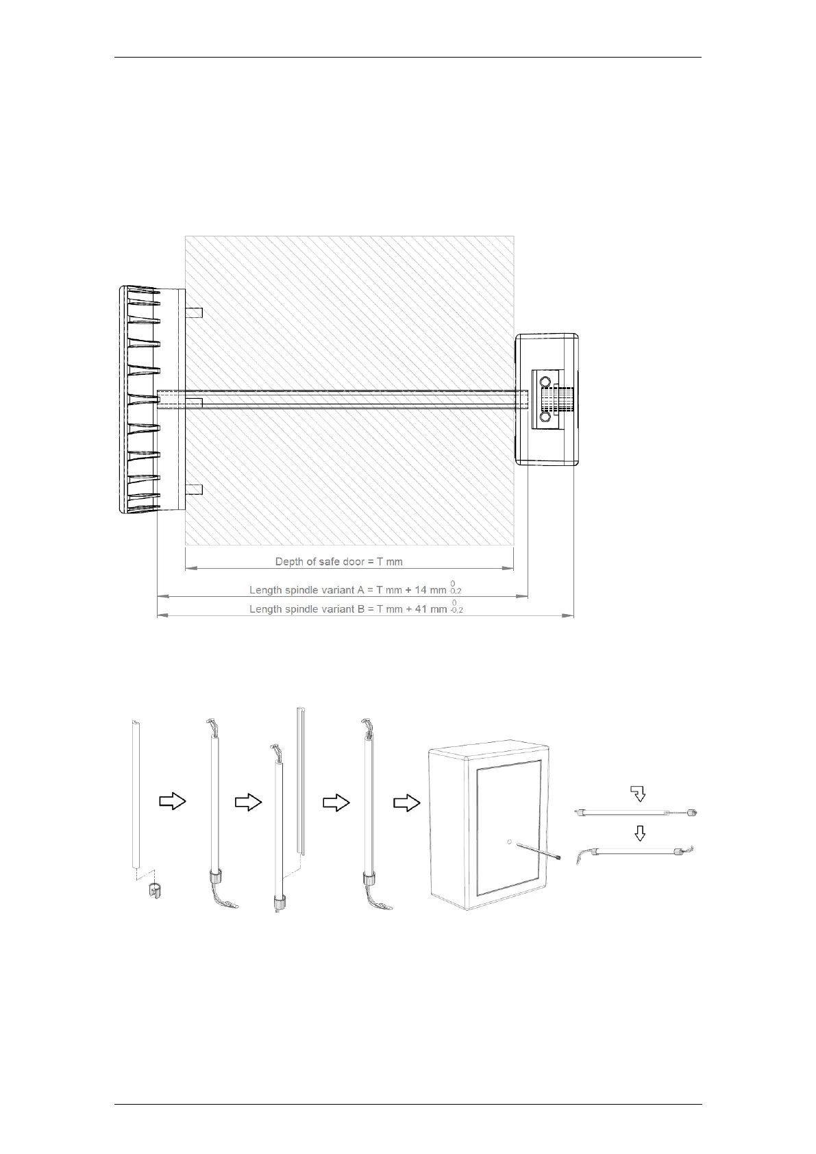 door = T mm) + connecting length in lock and operating unit (in all 14 mm with