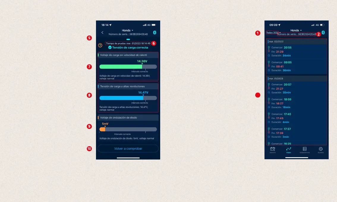 7. Tensión en vacío: Verde significa normal, rojo