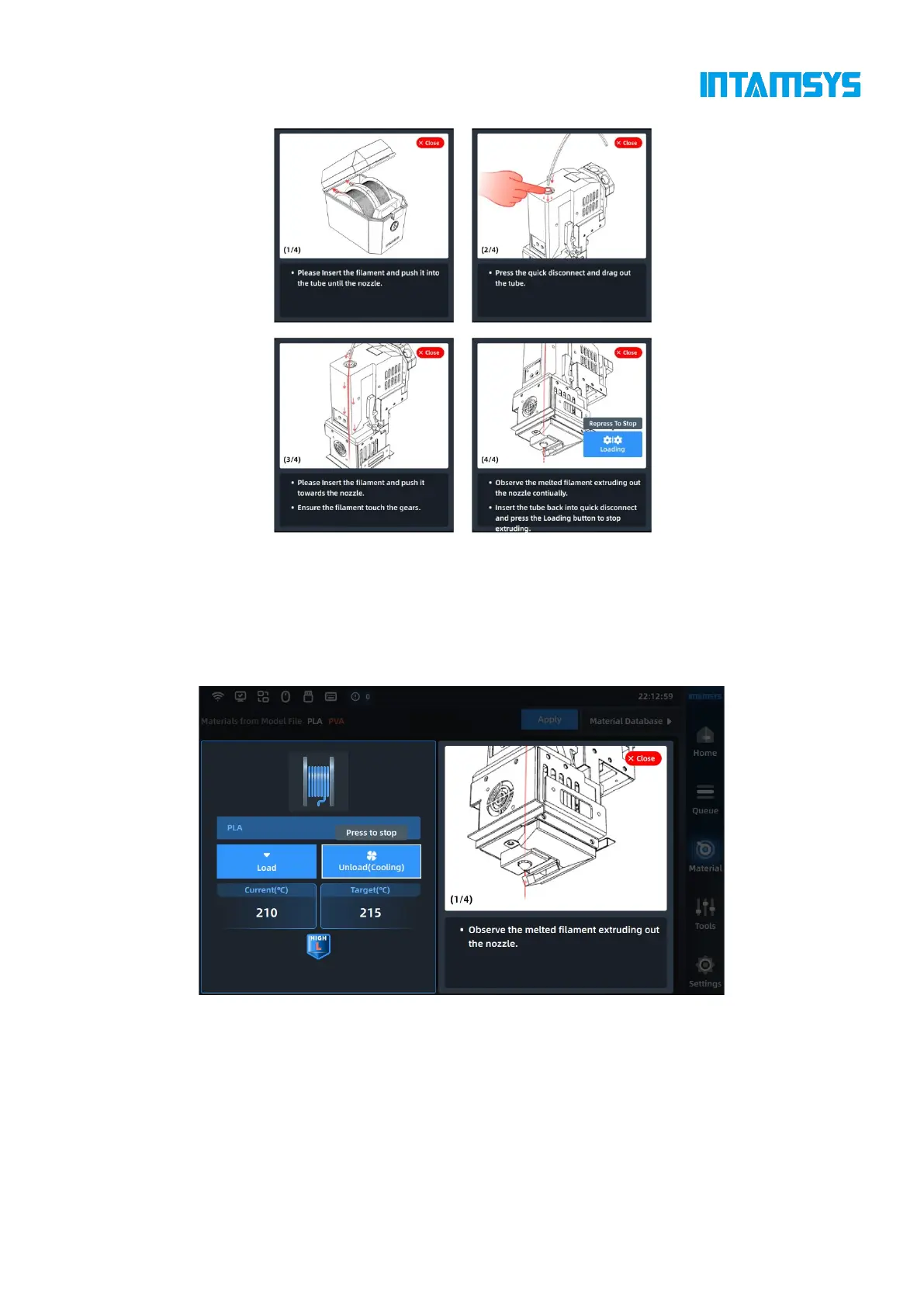 The material unloading process is similar to loading. Press the "Unload" button and unload the