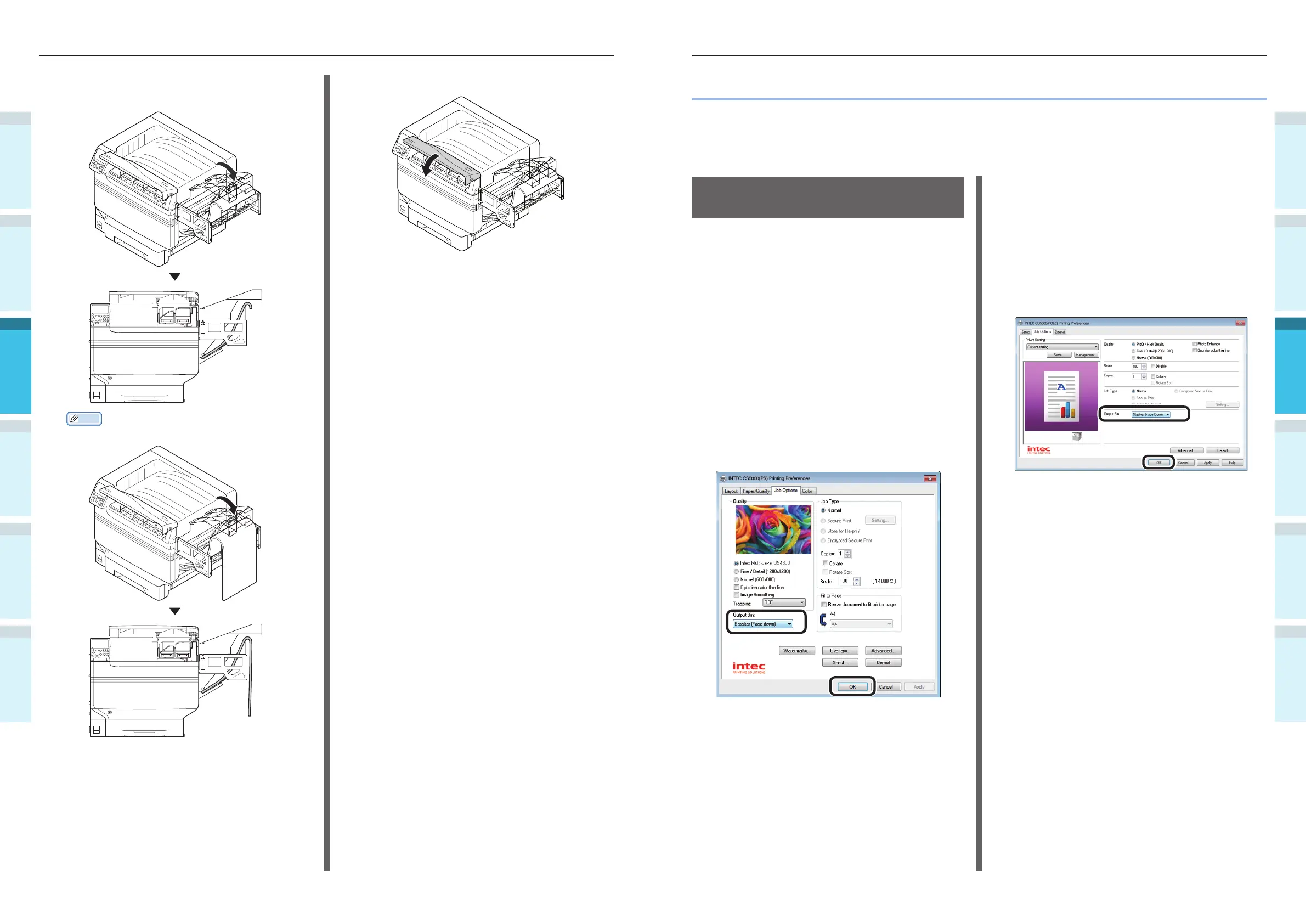 The printer outputs the paper either to the face-down stacker or the face-up stacker.