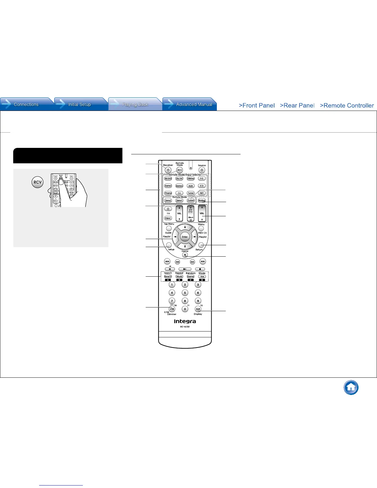 RCV button: Switches the remote controller to the