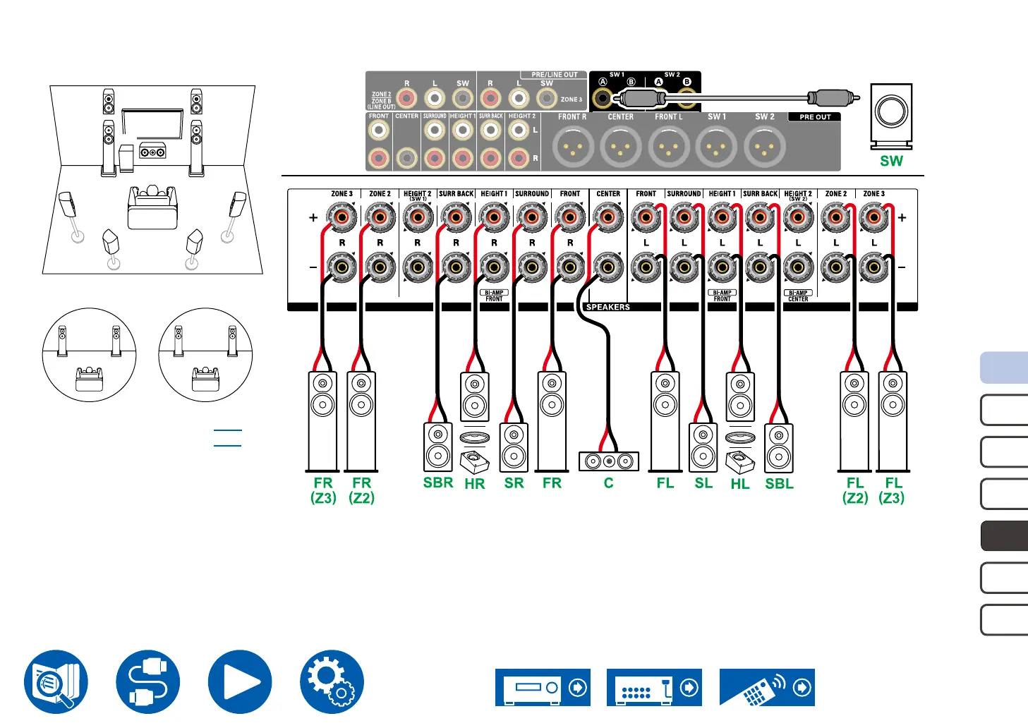 *1 Connect the Height Speakers you have actually installed (HL/HR: Height Speakers, Top Speakers, Dolby Enabled Speakers).