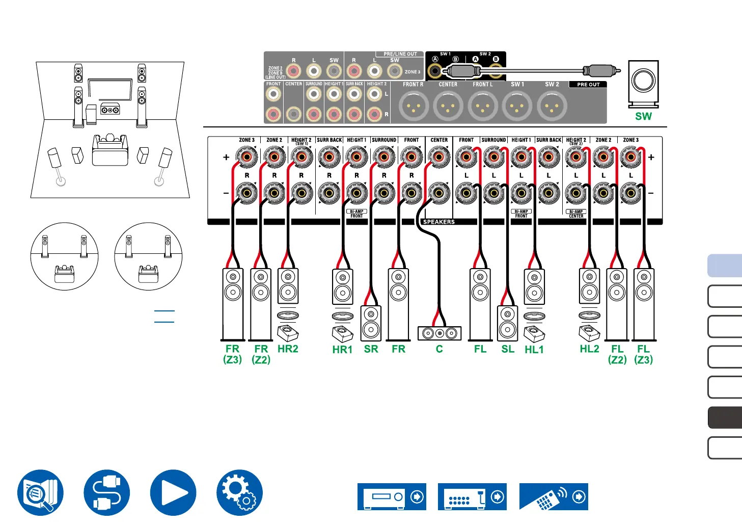 *1 Connect the Height Speakers you have actually installed (HL1/HR1: Front Height Speakers, Top (front side) Speakers, Dolby Enabled Speakers (Front)).