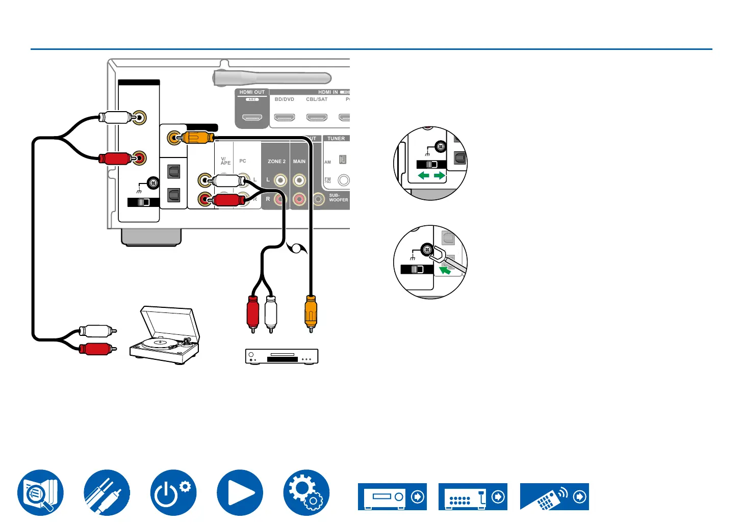 • Switch the MM/MC switch to suit the turntable cartridge type (MM or MC).