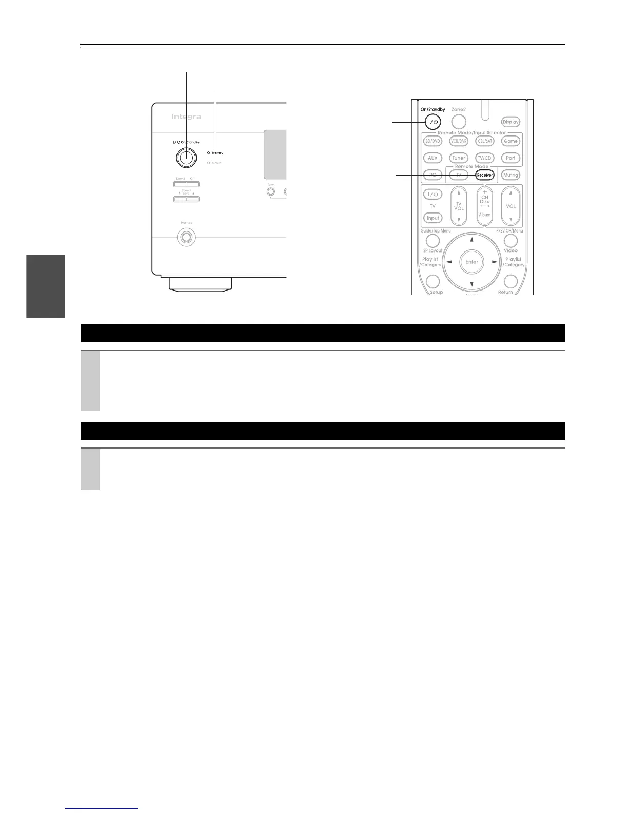 The AV receiver comes on, the display lights, and the Standby indicator goes off.