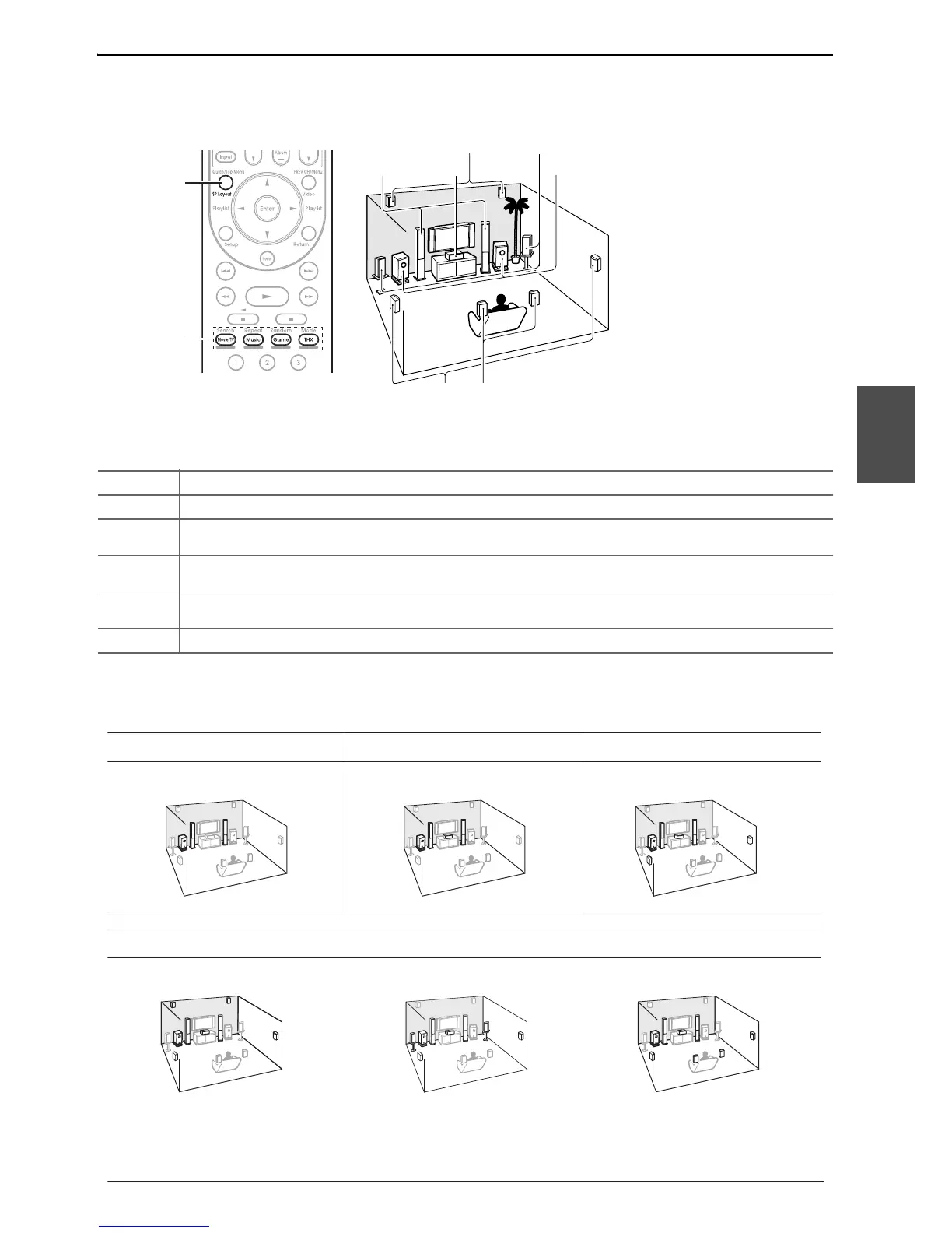 The illustration shows which speakers are activated in each channel. See “Speaker Configuration” for the speaker setup