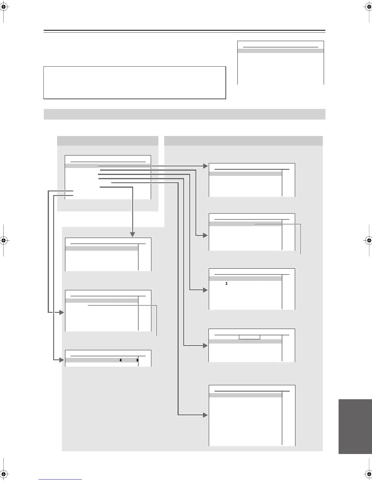 The following map shows how the setup menus are organized. Use the page numbers to locate information about items.