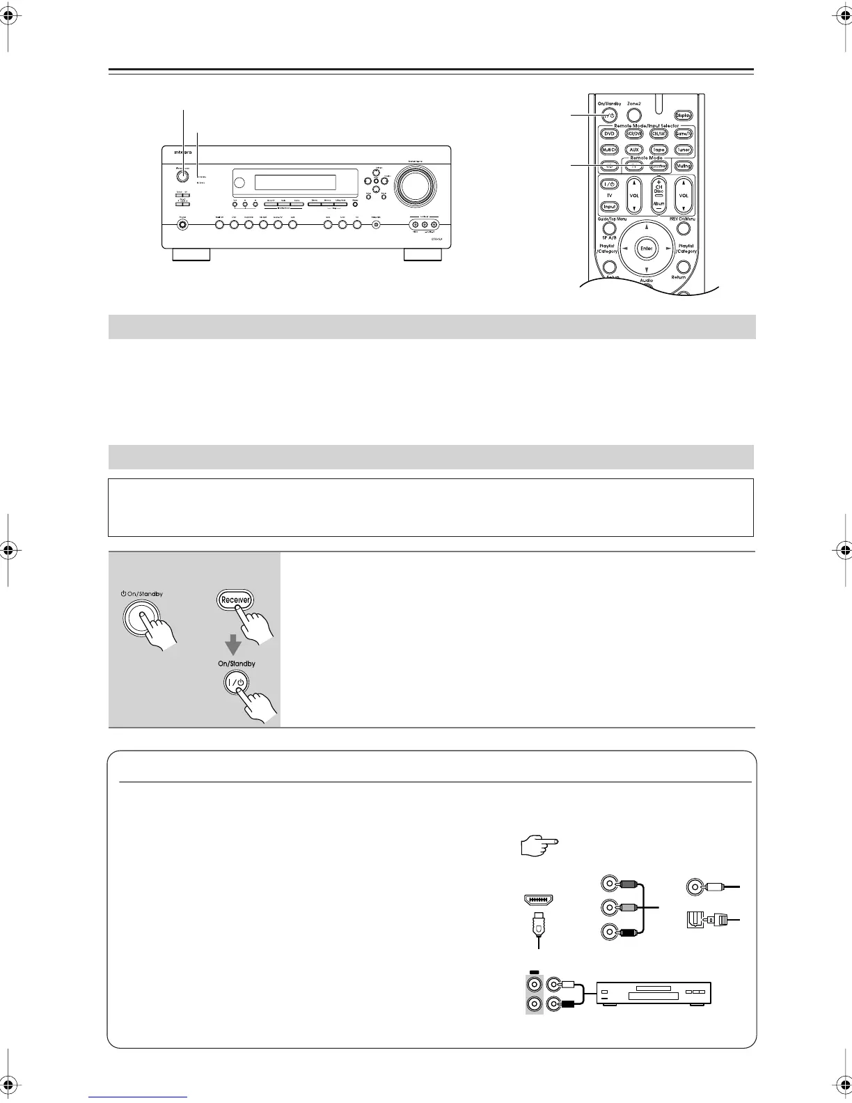 The AV receiver comes on, the display lights up, and the Standby indicator goes off.