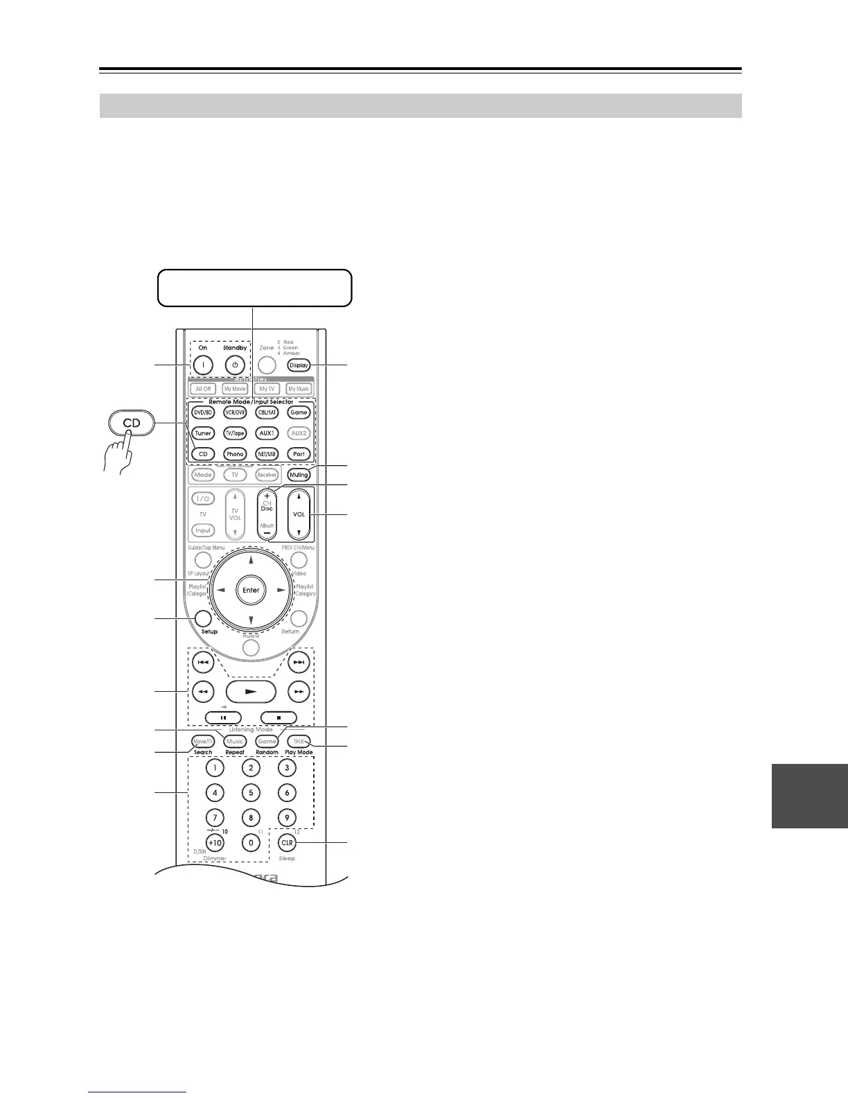 The [CD] button is preprogrammed with the remote con-