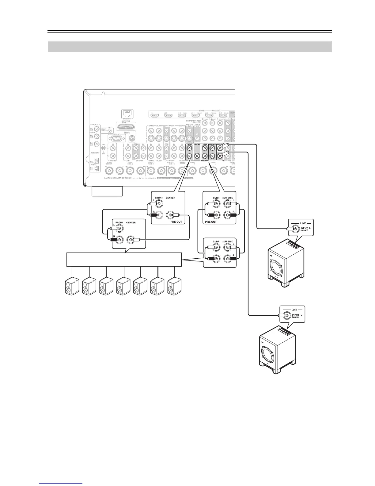 to this AV receiver’s PRE OUT: SUBWOOFER jack. You can connect the powered subwoofer with two PREOUT: