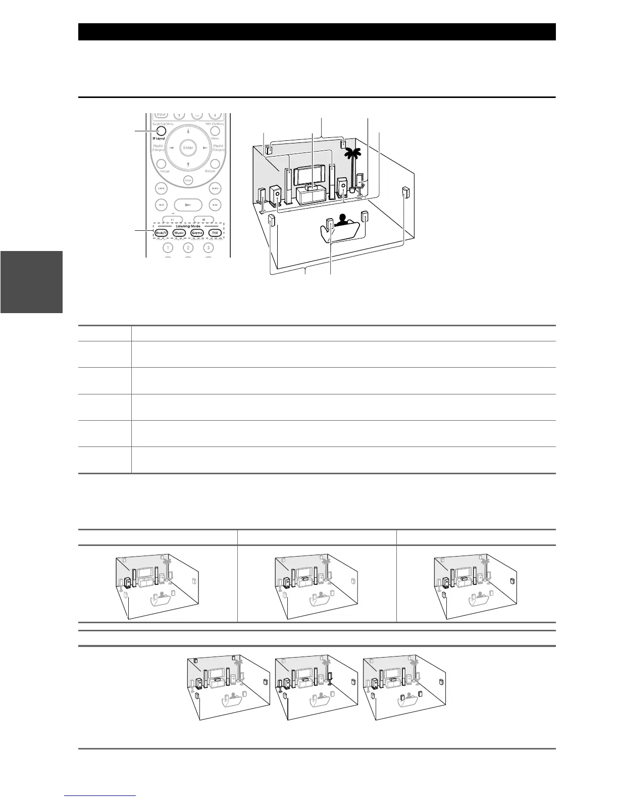 The illustration shows which speakers are activated in each channel. See “Speaker Configuration” for the speaker setup