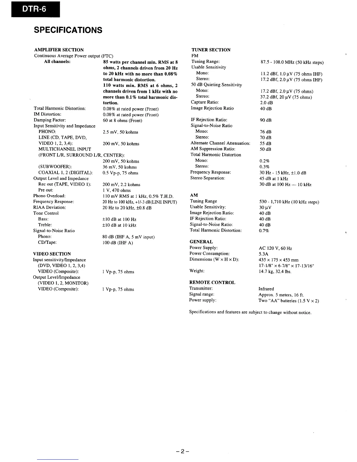Integra DTR-6 - Technical Specifications; Amplifier, Tuner, and General Specifications