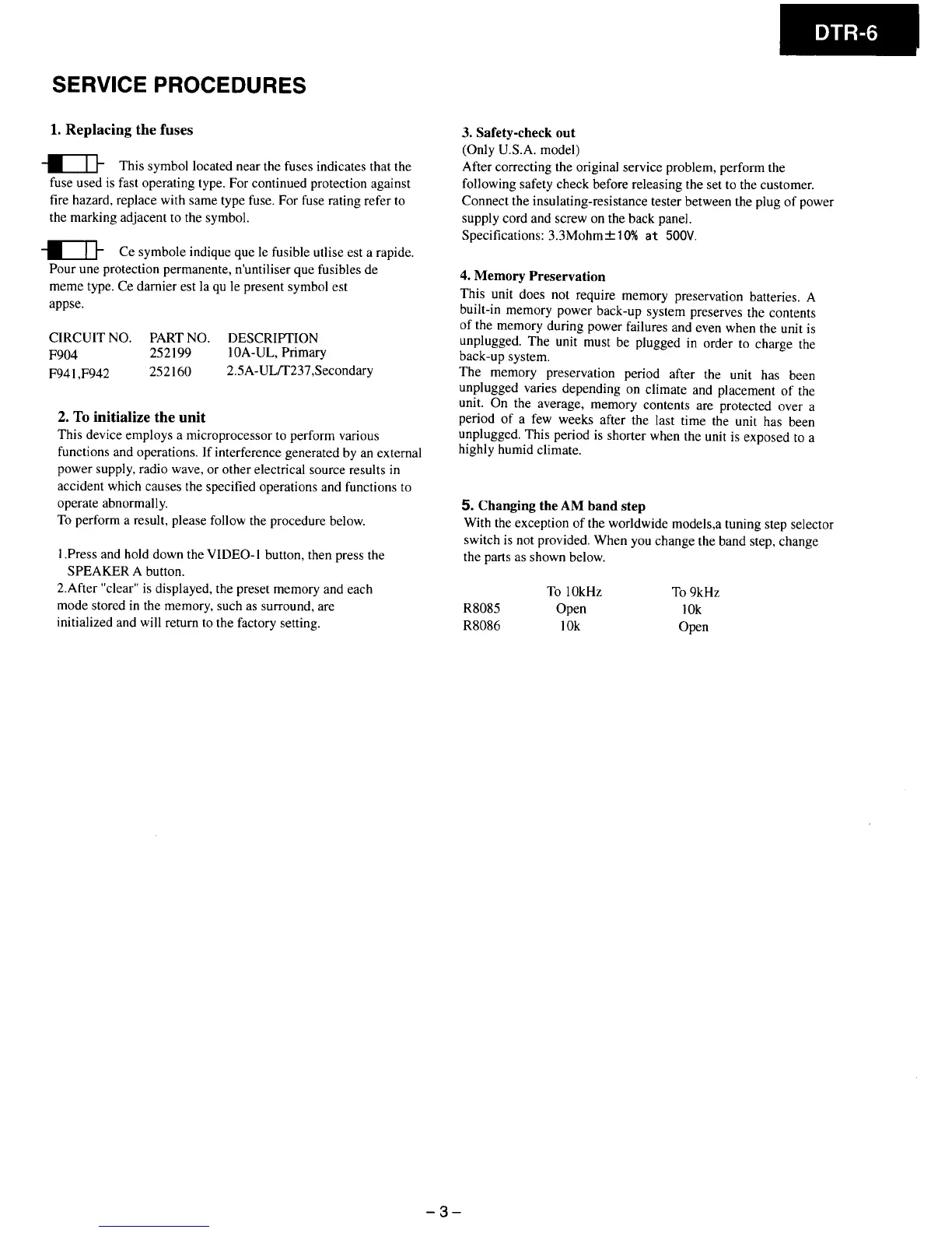 Integra DTR-6 - Service Procedures; Fuse Replacement, Initialization, and Safety Checks