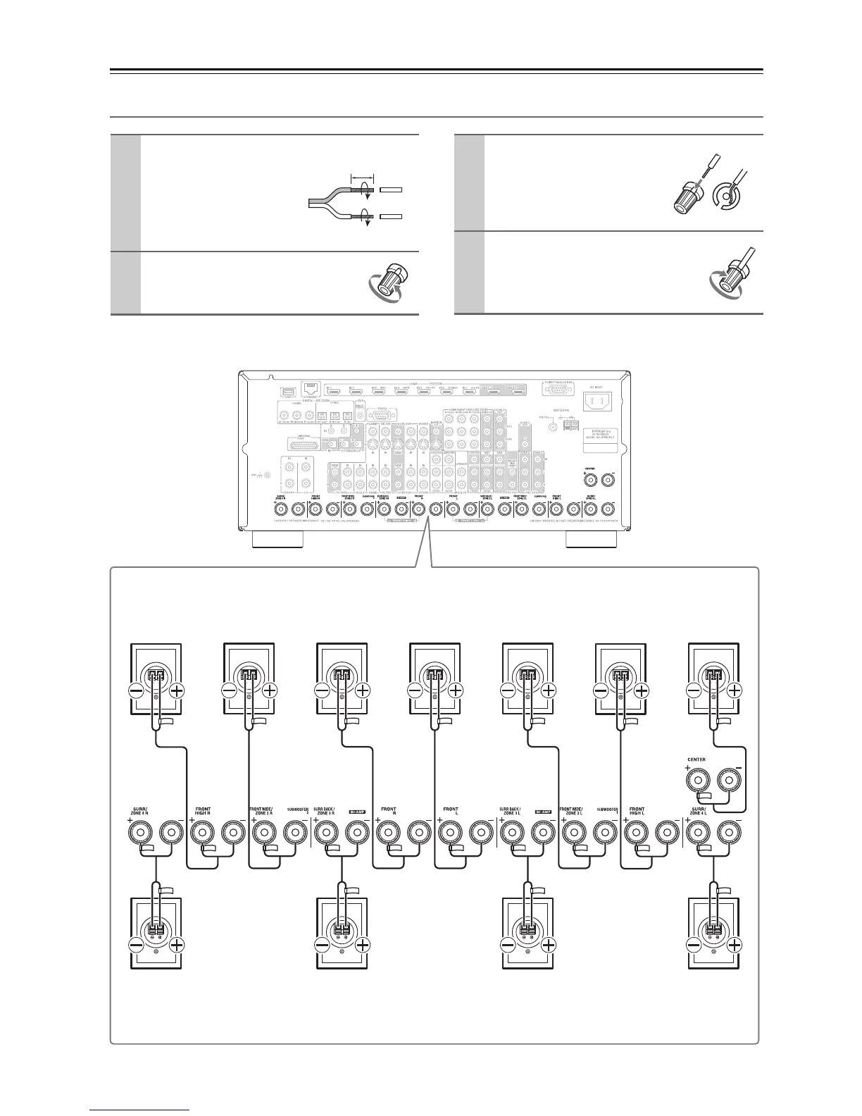 The following illustration shows which speaker should be connected to each pair of terminals. If you’re using only one