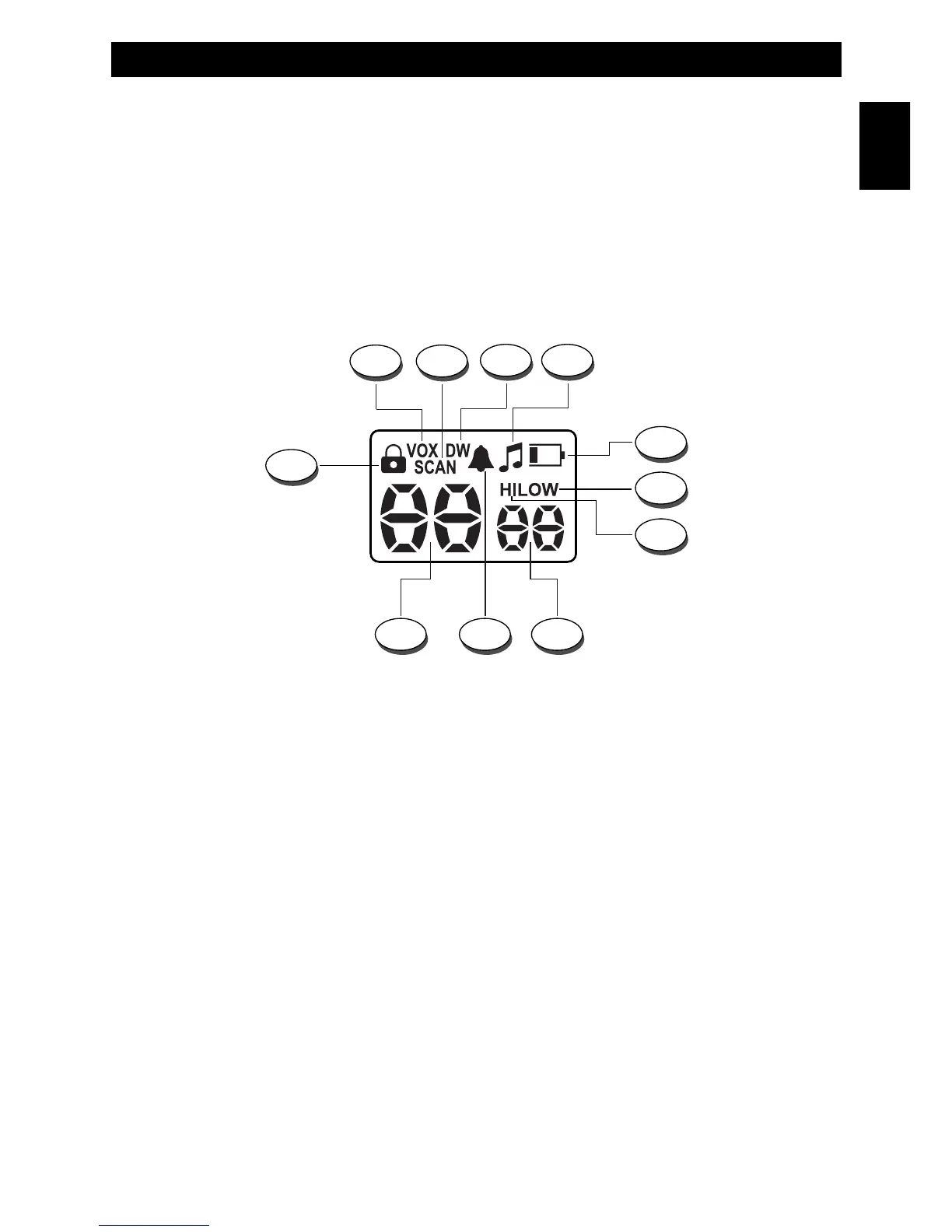 The HI icon (G) is lighted when the trasmitter is in the HIGH POWER mode (PMR channels only).