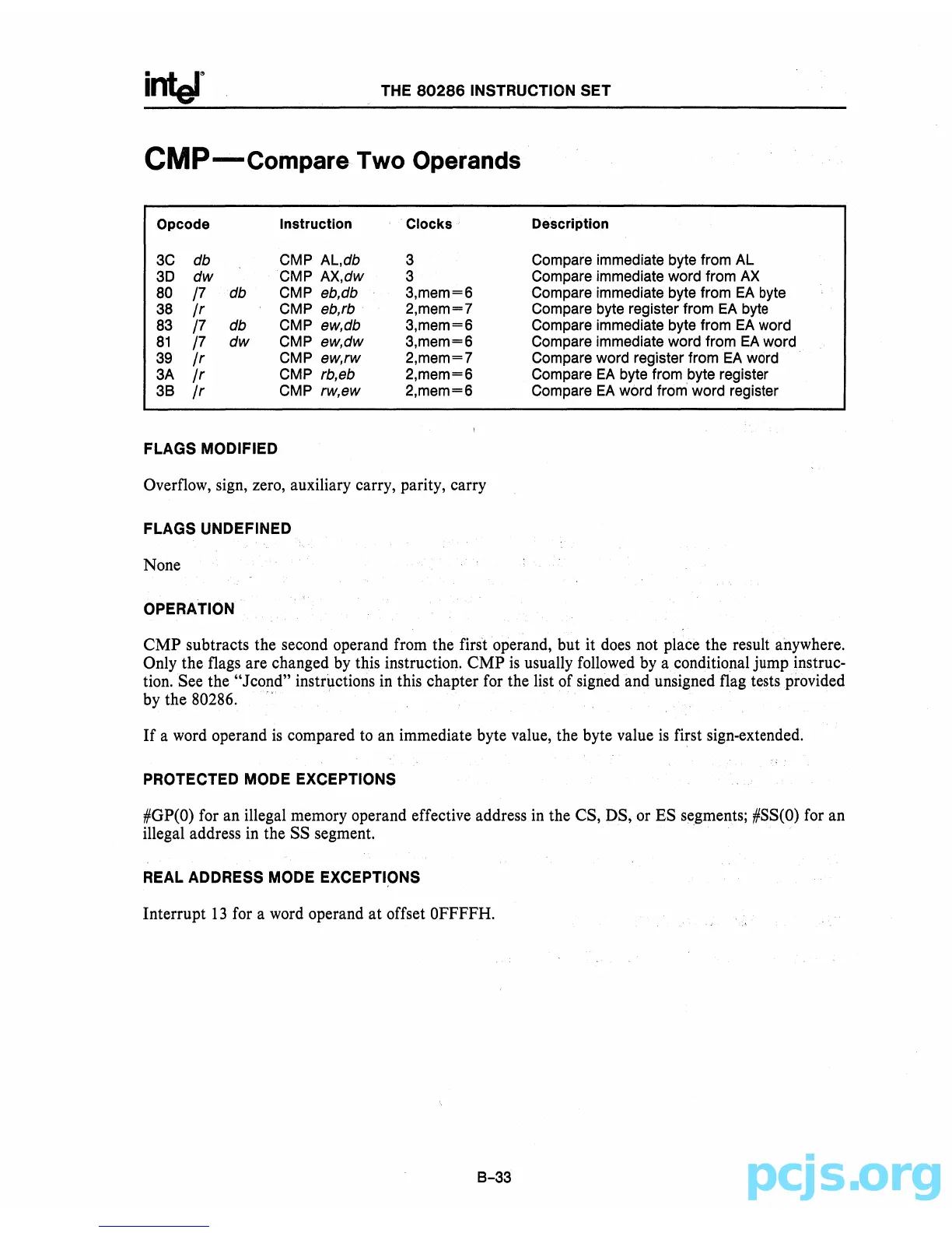 subtracts the second operand from the first operand, but it does not place the result anywhere.