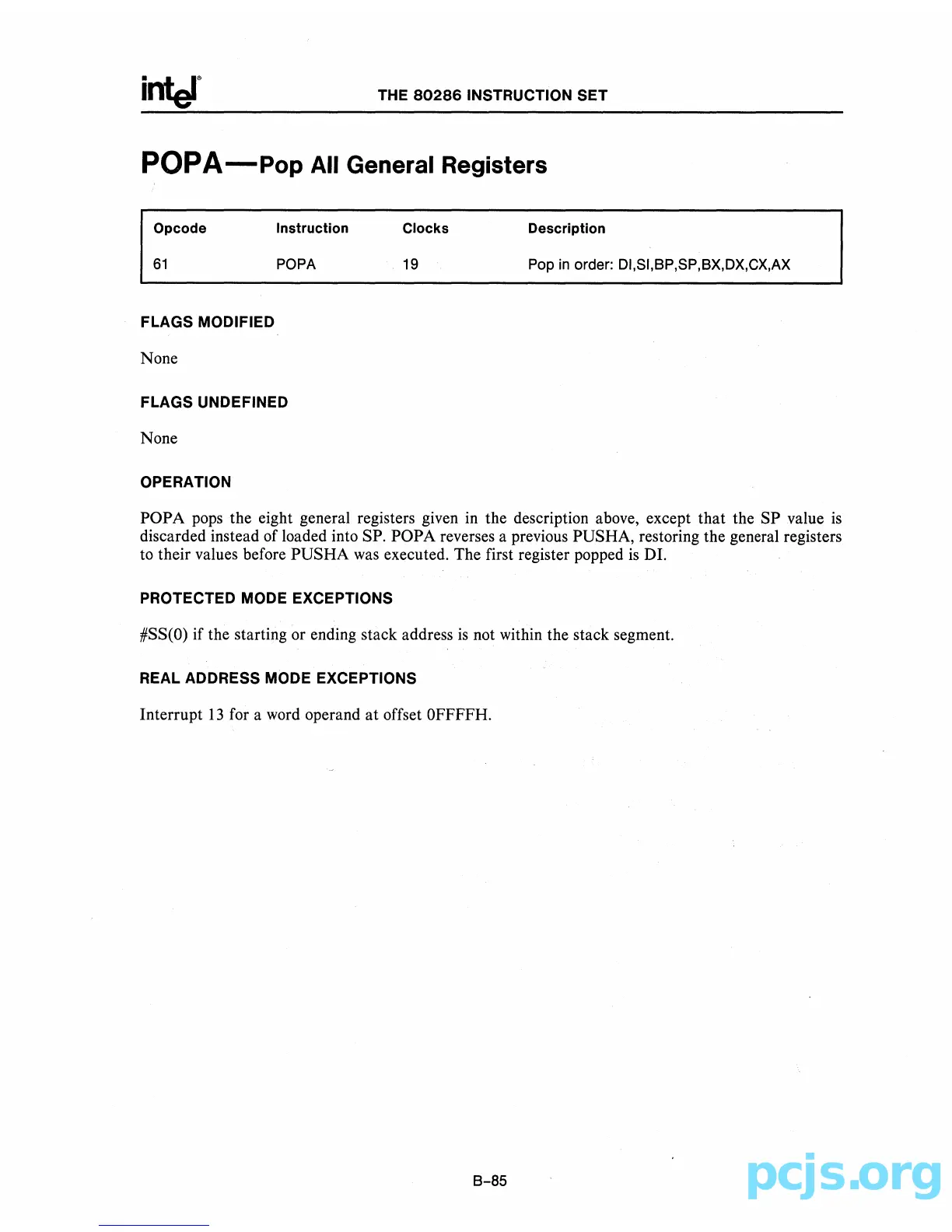 discarded instead of loaded into SP. POPA reverses a previous PUSHA, restoring the general registers