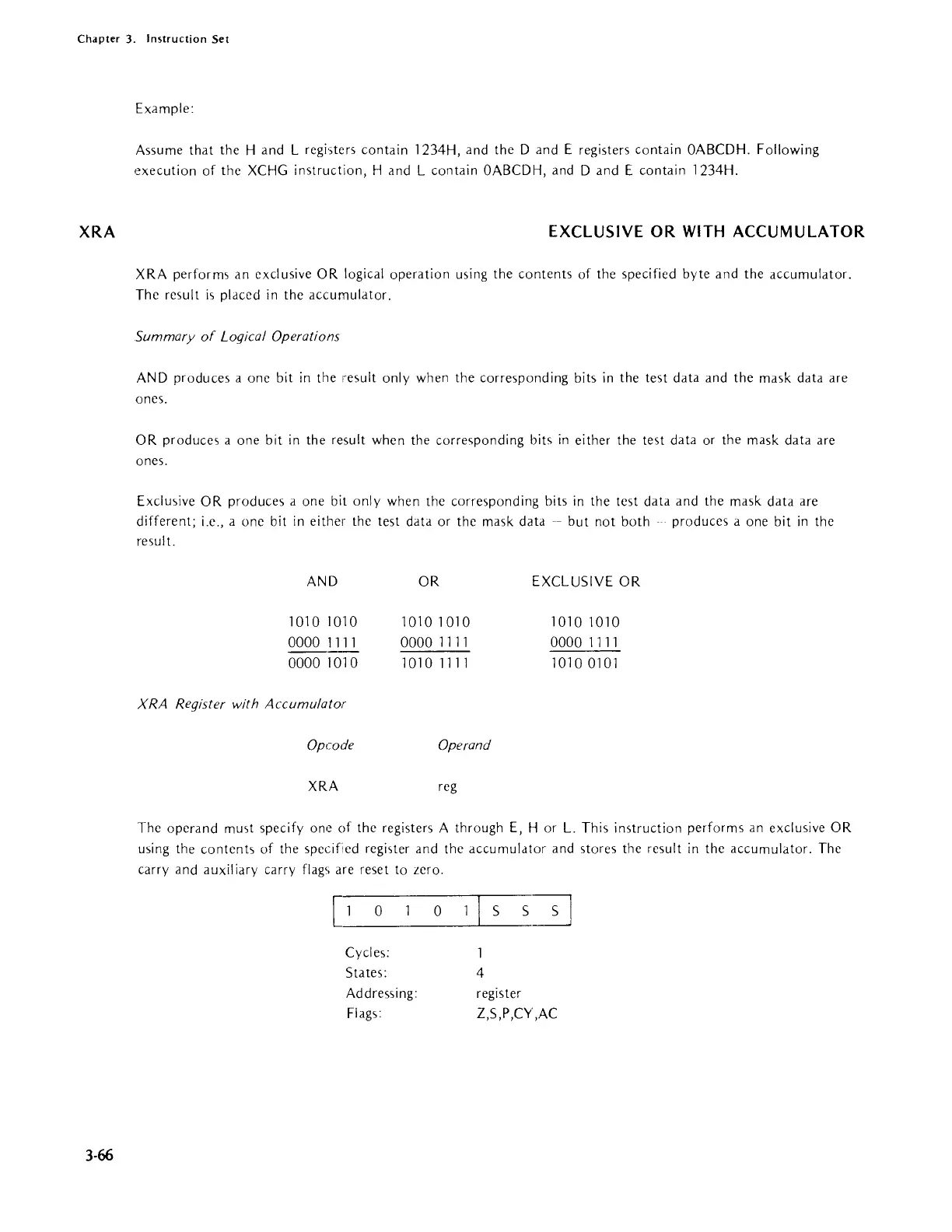 XRA performs an exclusive OR logical operation using the contents of the specified byte and the accumulator.
