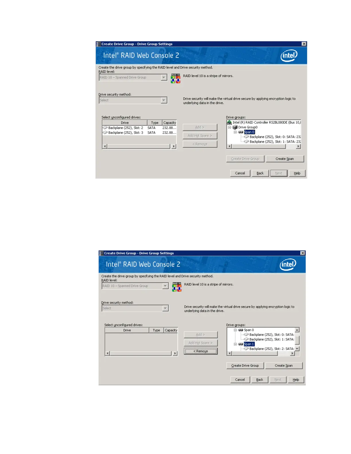 e. The selected drives appear under Span 1 below Drive Group 0, as shown in