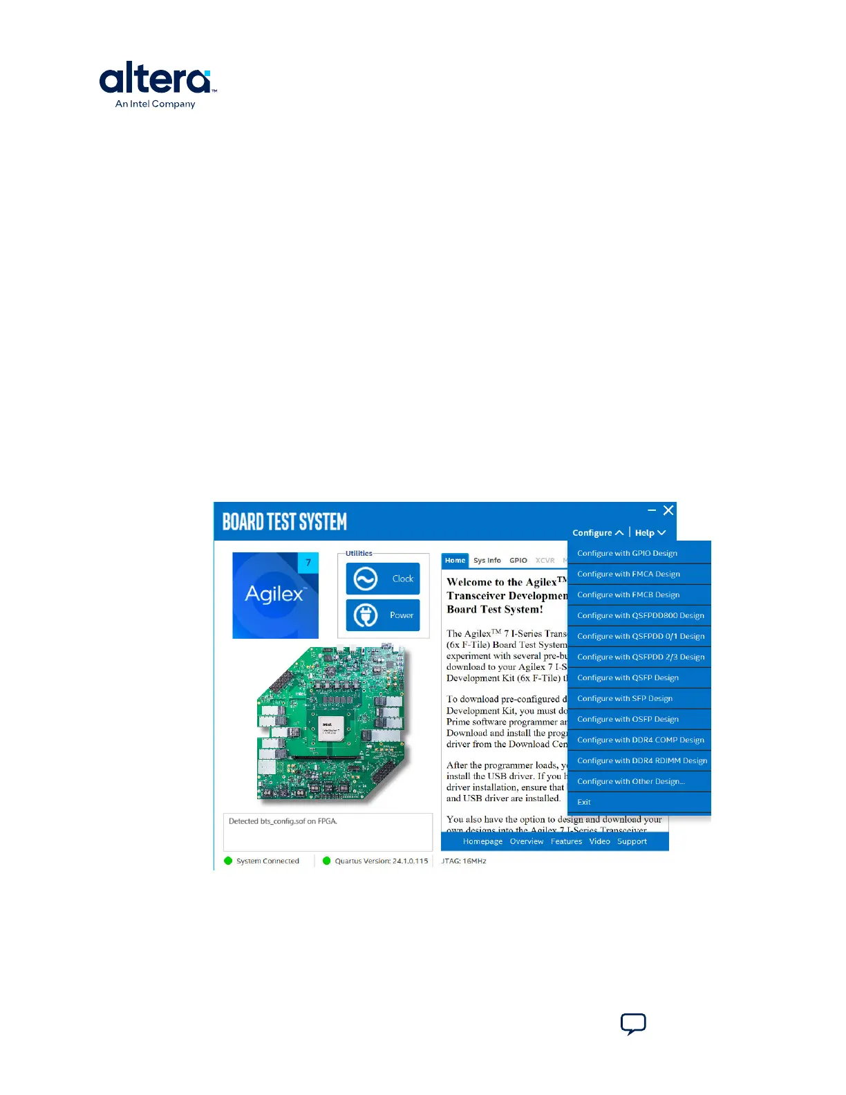Use the Configure menu to select the design you want to use. Each design example