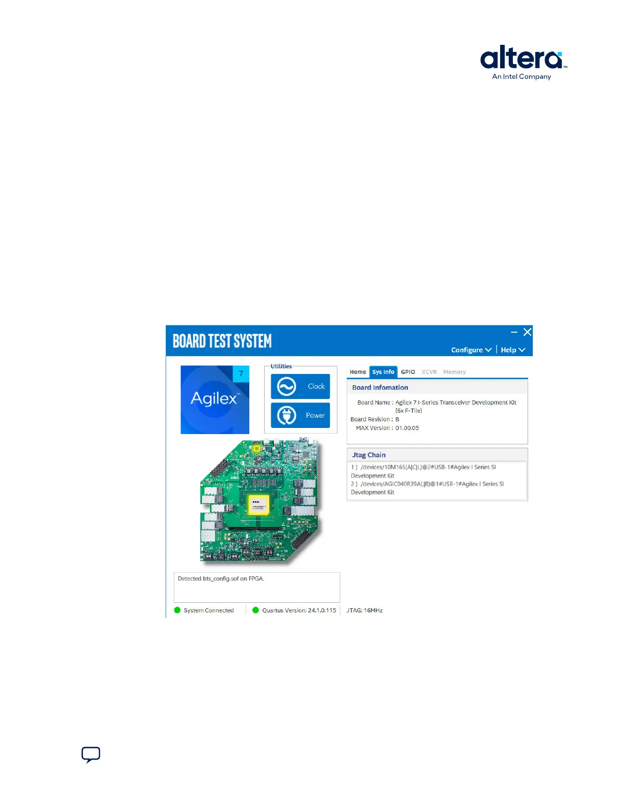 displays the board information, JTAG Chain devices and other details stored on the