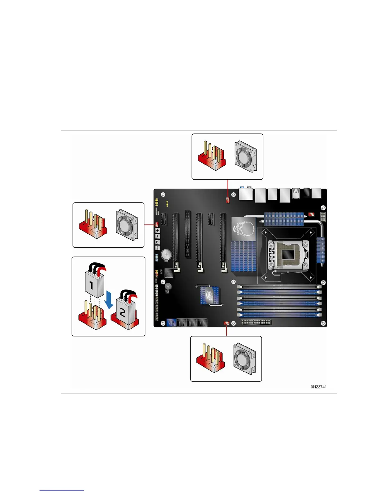 Connect chassis fan cables to the chassis fan headers on the Desktop Board.