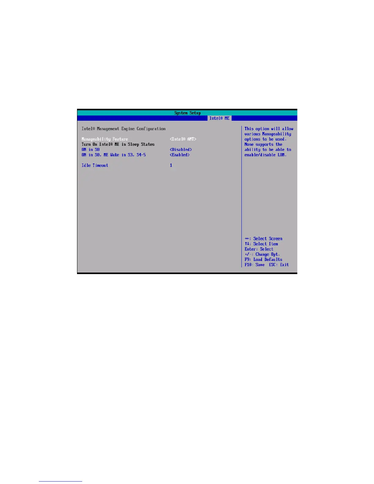the Intel ME Power Policy; and set the Idle Timeout, the amount of time, in seconds, Intel ME must be idle