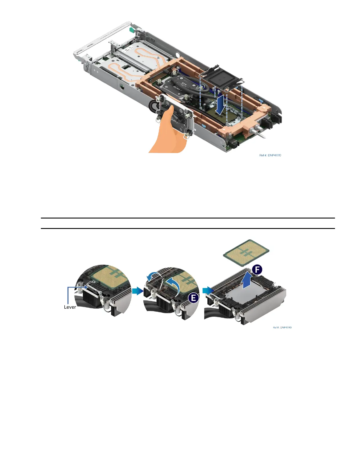 8. While holding down the processor cold plate without stretching the hose, rotate the lever (see Letter E)