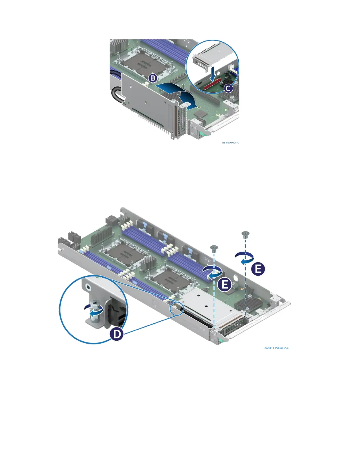 1. Tilt the riser assembly down and align the riser card with the riser slot on the server board (see Letter