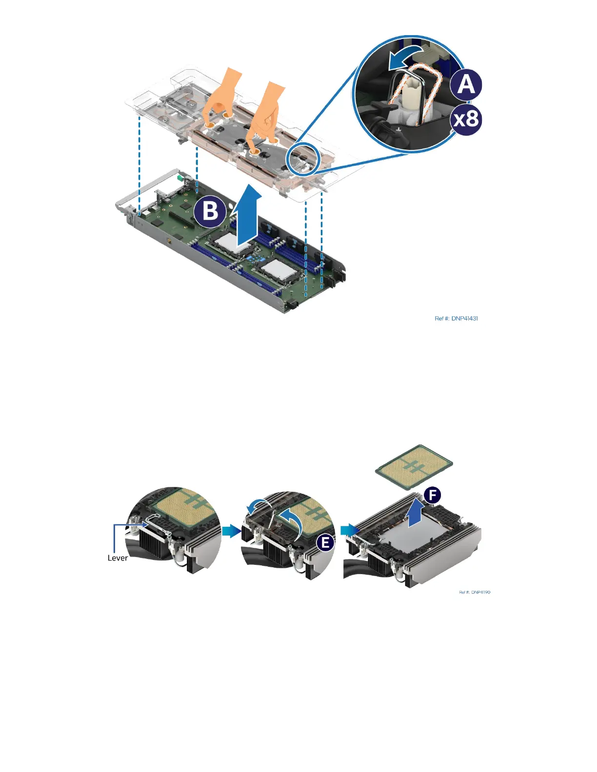 9. Rotate the lever (see Letter E) from right to left until the processor lifts from the processor carrier clip.