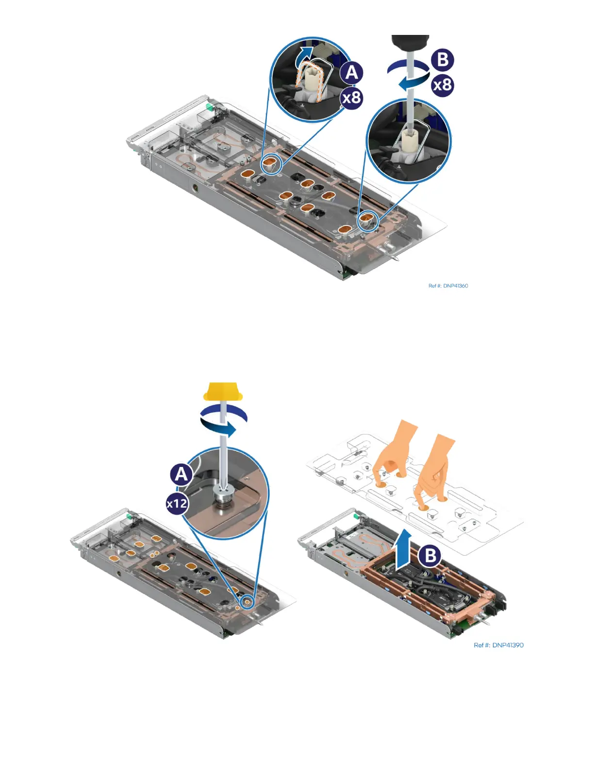 28. Tighten the fasteners on the cold plates to 8 in-lb using a Torx T30* screwdriver (see Letter B). No