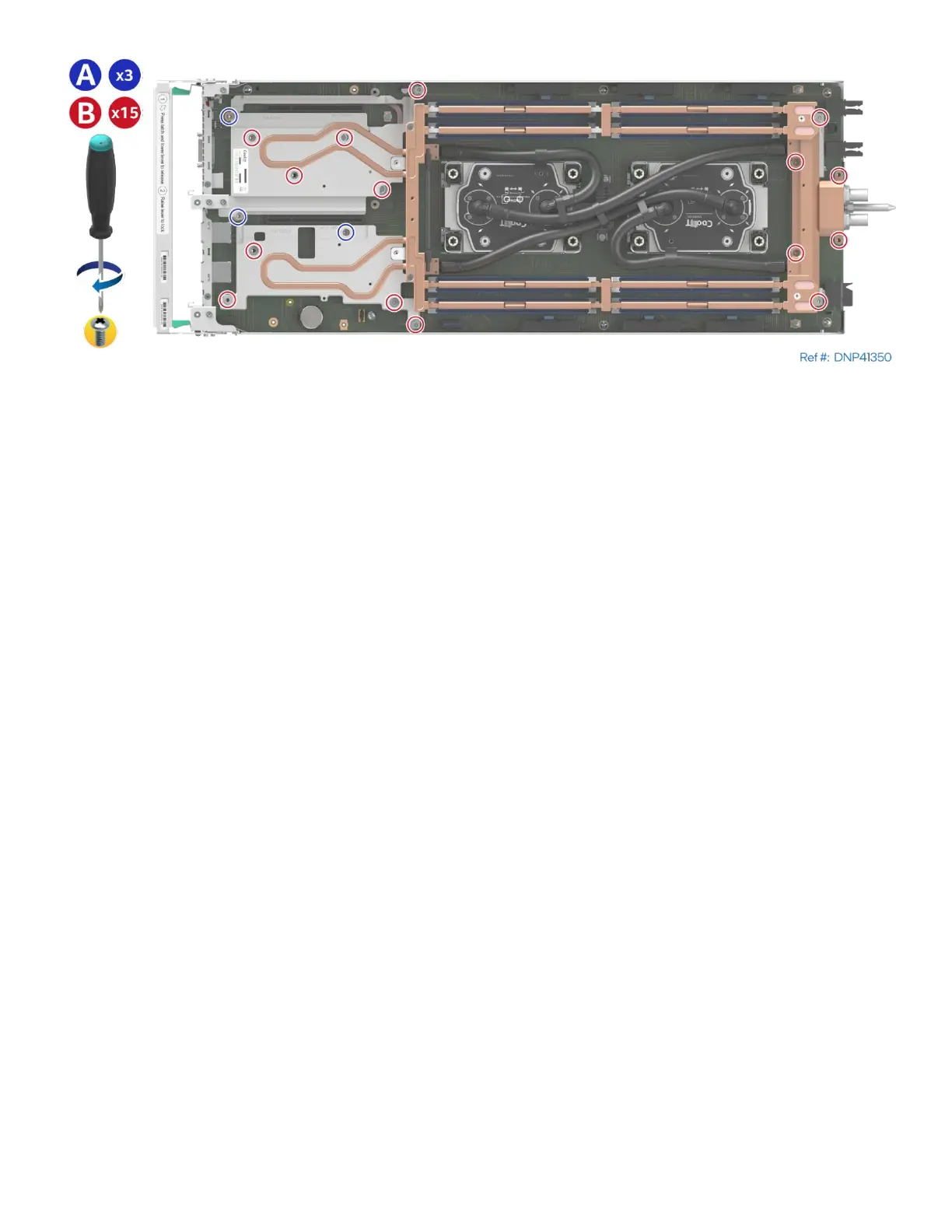 30. Using three 8-mm long screws with washers (see Letter A), secure the liquid-cooling loop to the server