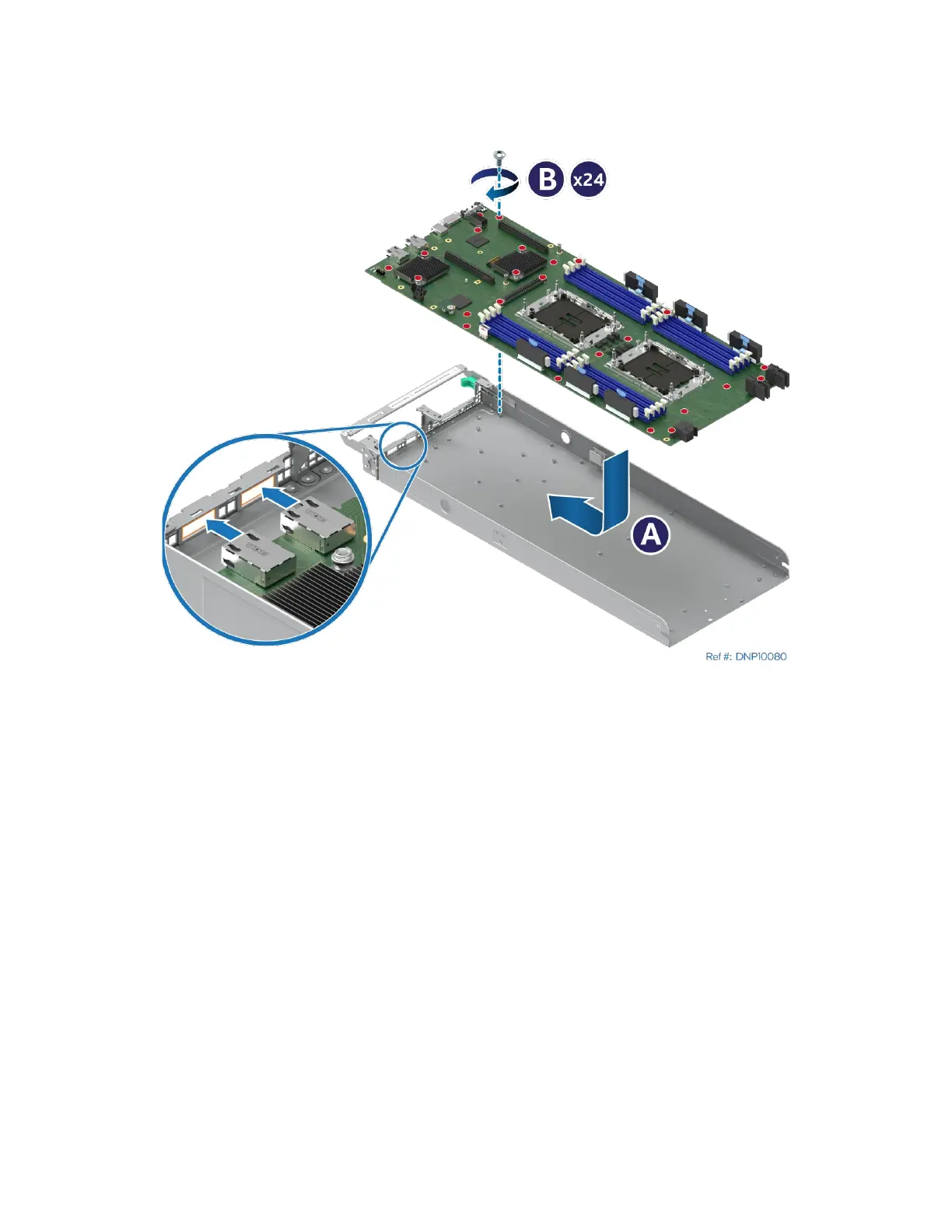 13. Fasten the server board to the module tray using all the screws (see Letter B). Tighten to 5 in-lb.