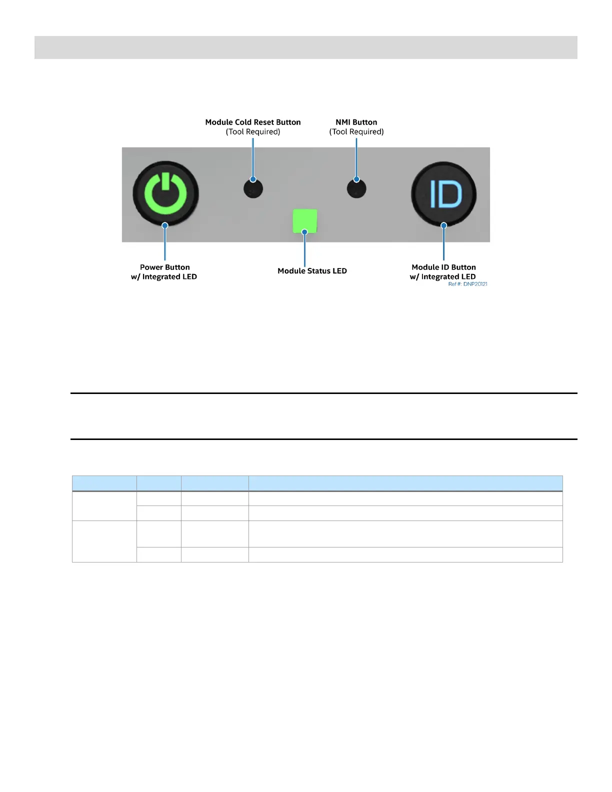 • Module ID button with integrated LED: Toggles the integrated blue ID LED on and off. The module ID