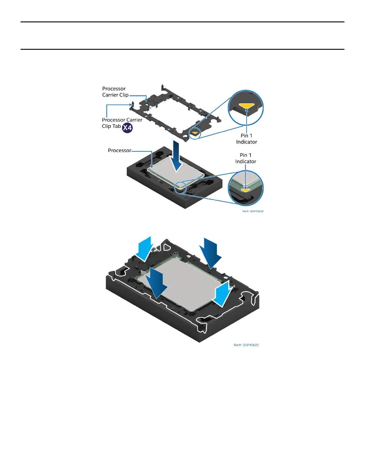 2. Ensure that the Pin 1 indicator on the processor carrier clip is aligned with the Pin 1 indicator of the