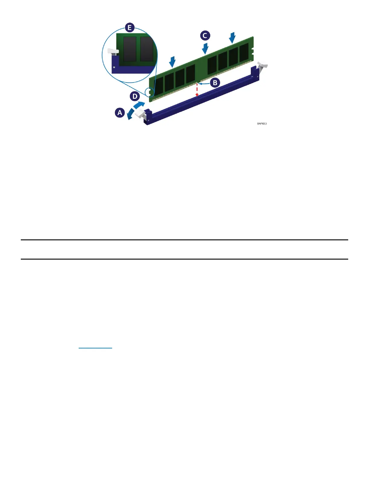 5. Insert the memory module into the memory slot. Using even pressure along the top edge, push down