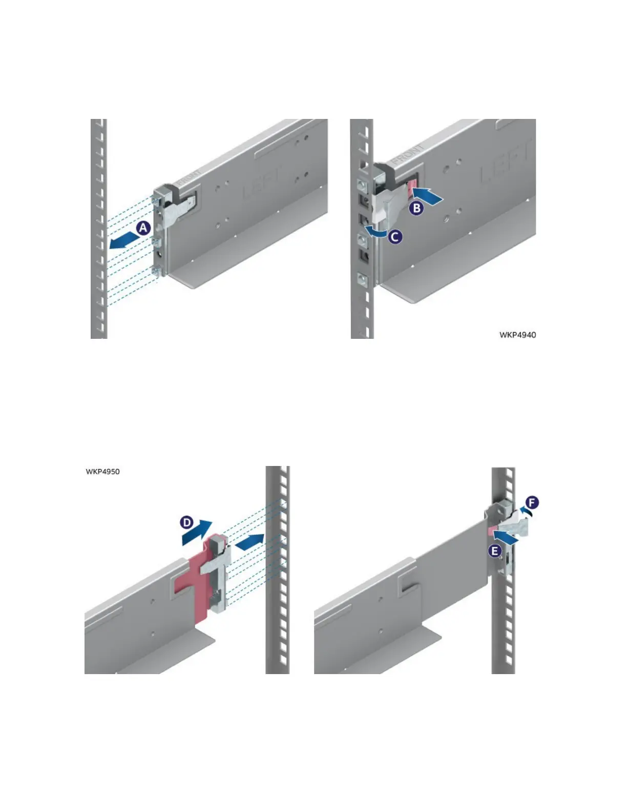 7. Release the clip once the guides are fully inserted into the rack (see Letter F).