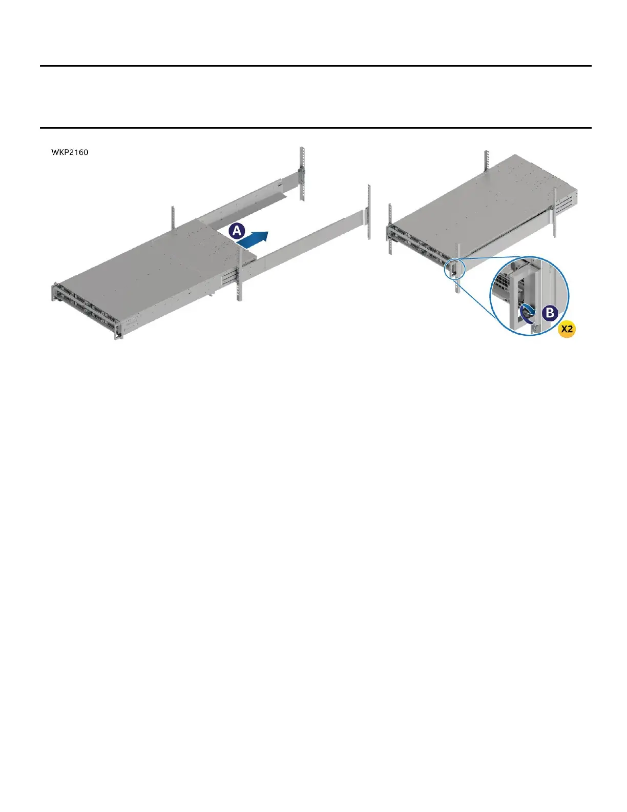 1. Insert the chassis onto the rails from the front of the rack and slide it towards the rear of the rack (see