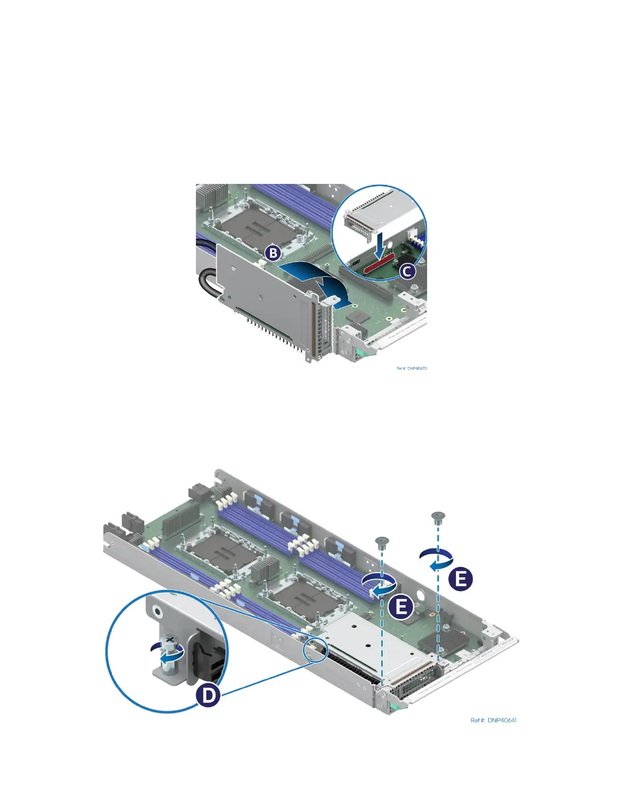 1. Align the riser card to the riser slot on the server board and tilt the riser assembly down (see Letter B).