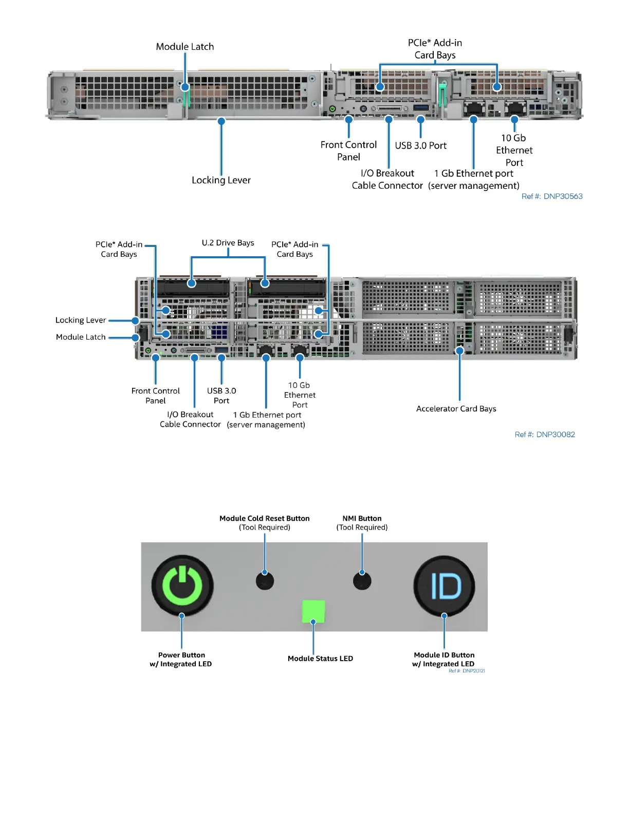 Intel D50DNP Series - Front Control Panel and I;O Breakout Cable Feature Identification; Figure 112. Intel Data Center GPU Max Series Accelerator Module Feature Identification; Figure 113. 2 U Pcie* Accelerator Module Front Panel Feature Identification; Figure 114. Front Control Panel Features
