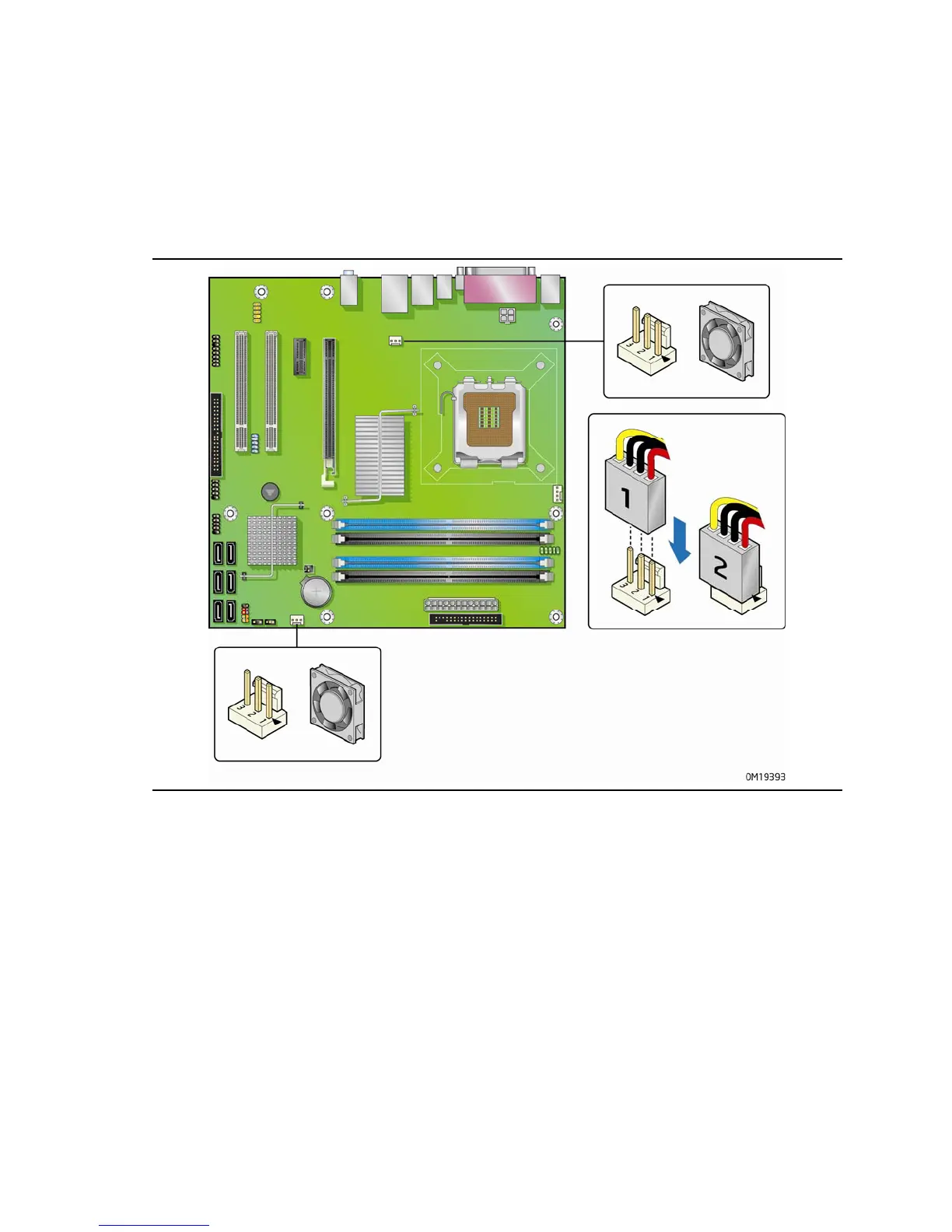Connect the chassis fan cables to the two chassis fan headers on the desktop board.