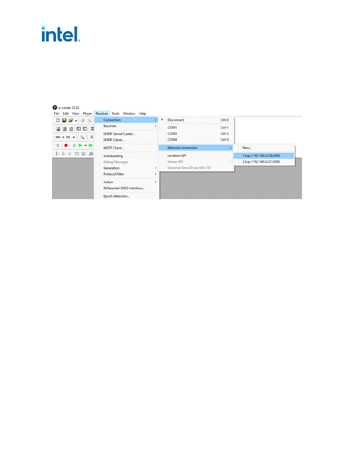 Connecting through TCP in the U-center software:
