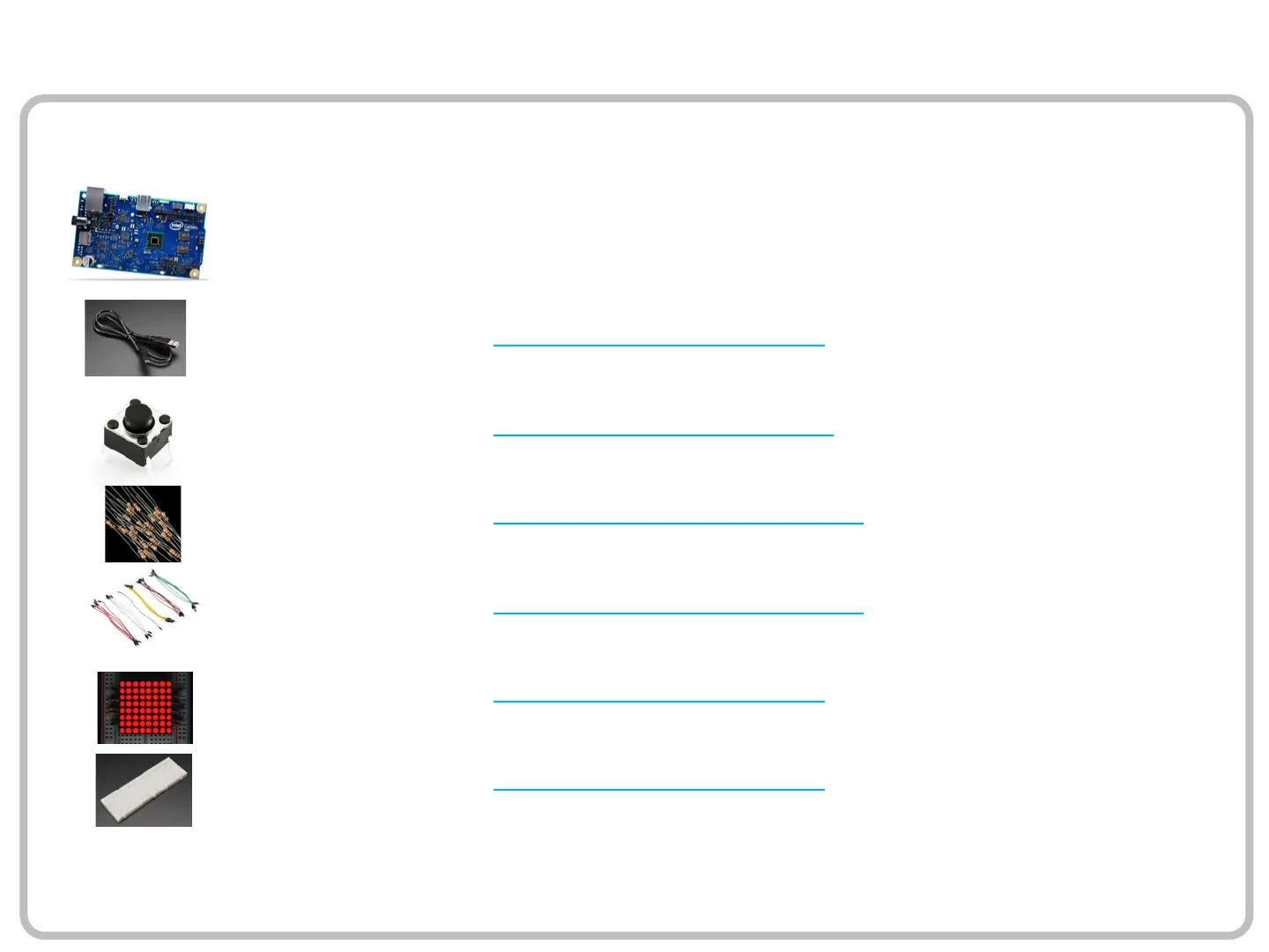 Breadboard http://www.adafruit.com/products/239 $5.95 ea 1 $ 5.95
