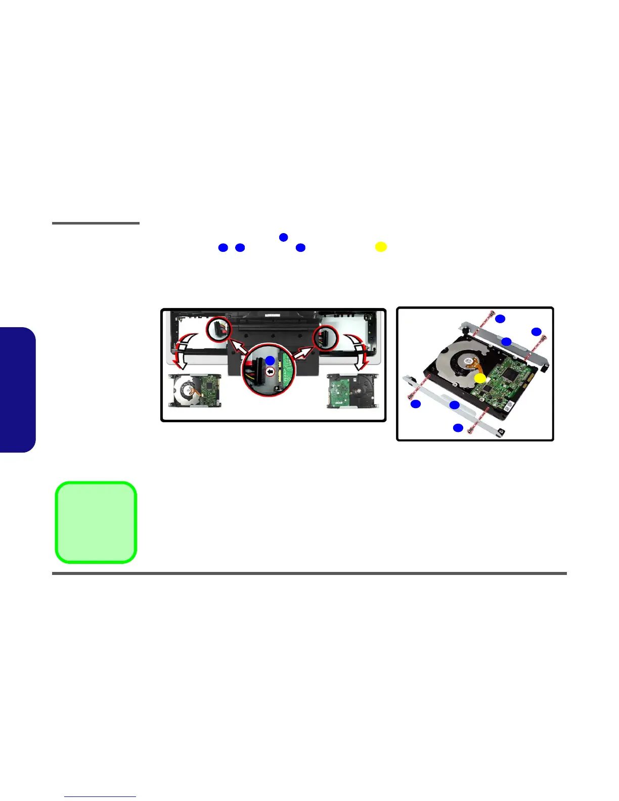 8. Remove screws - , and brackets from the hard disk .