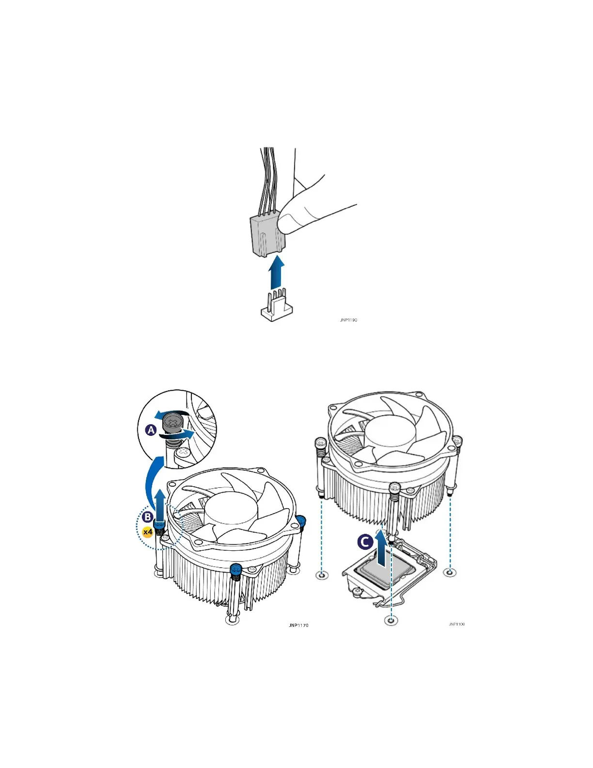 1. Remove the fan cable from the 4-pin processor fan connector labeled “CPU_Fan” on the server board.