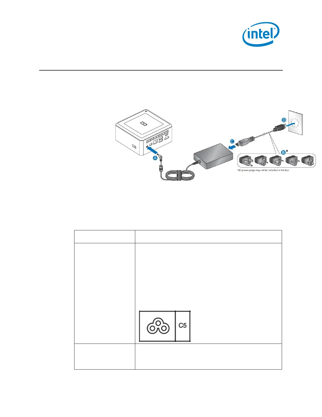 Each Intel NUC model includes either a region-specific AC power cord or no AC power