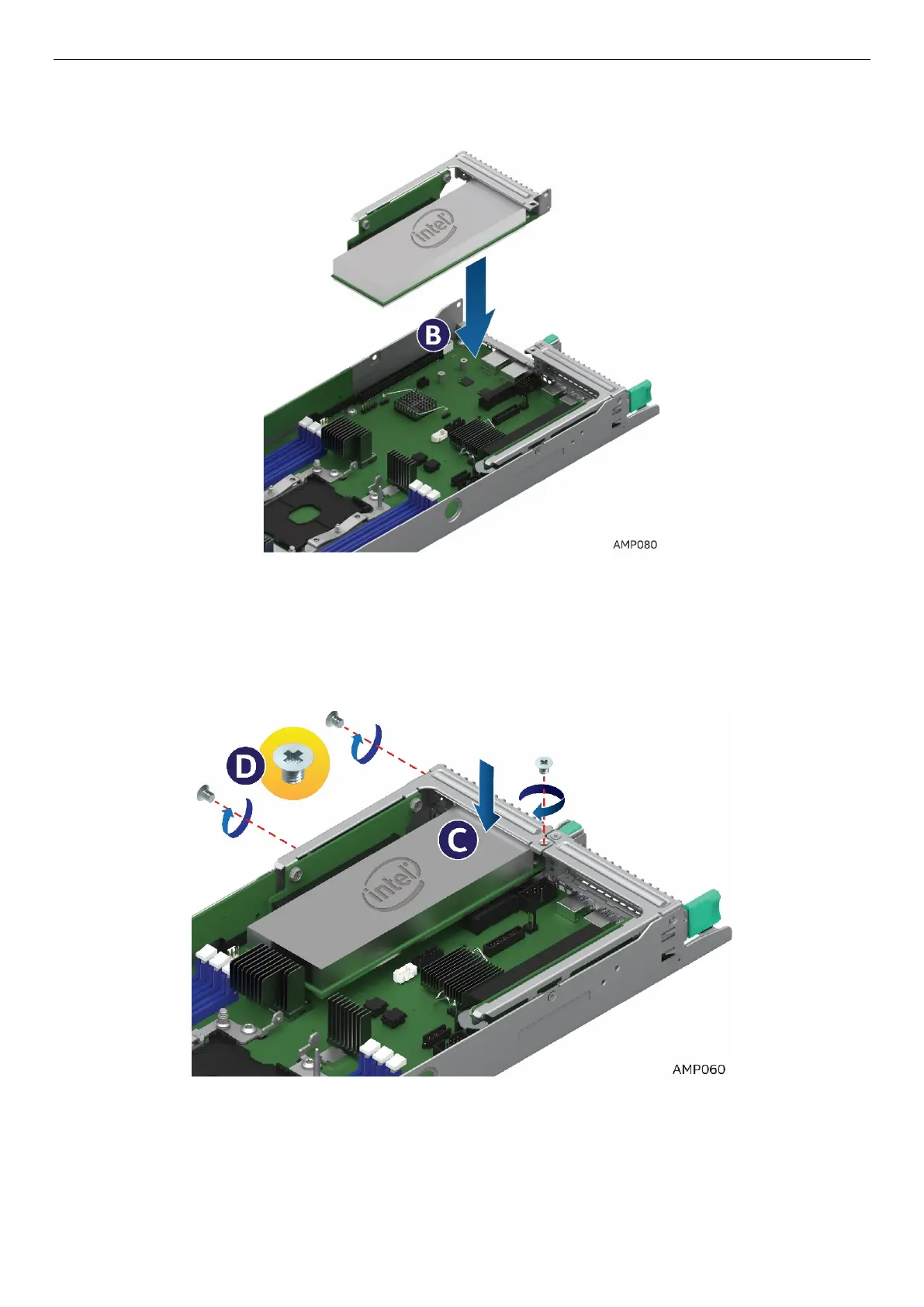 7. Ensure that the Add-In Card and Riser are fully seated (See letter C).