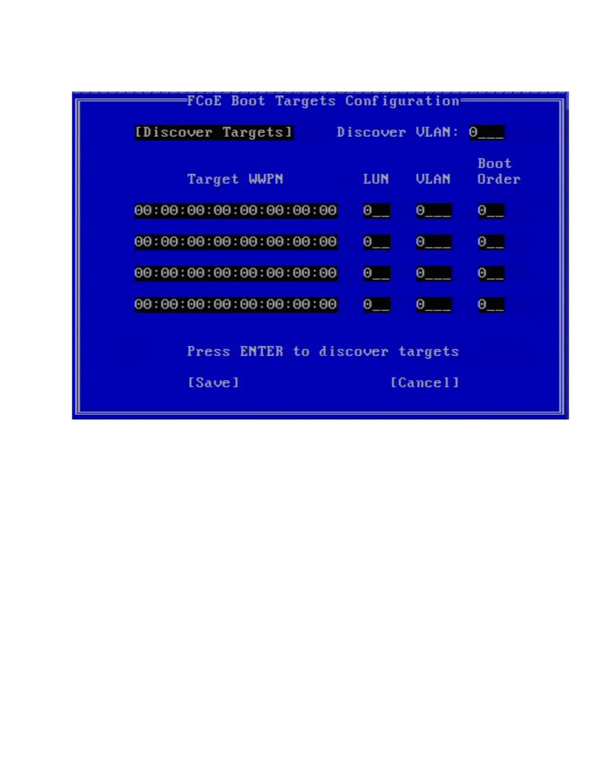 FCoE Boot Targets Configuration: Discover Targets is highlighted by default. If the Discover VLAN