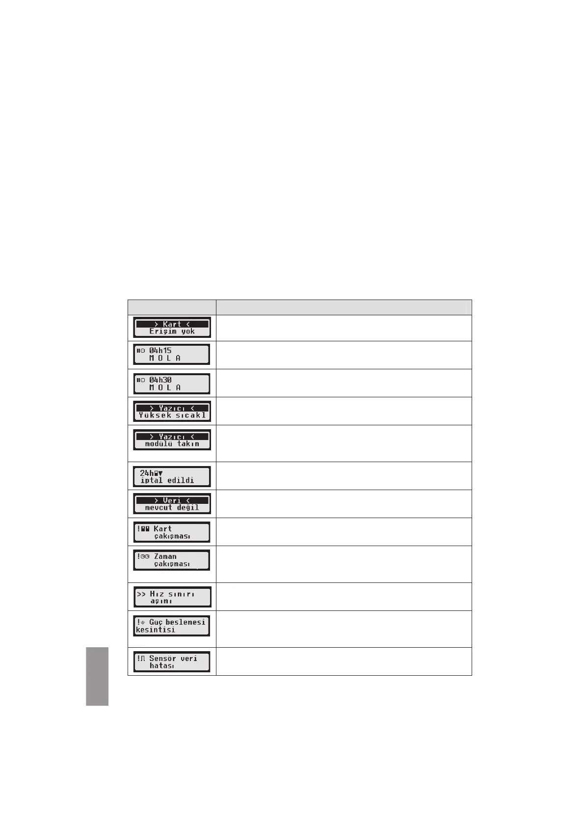 EFAS dijital takometre farklÕ mesajlar ve uyarÕlar verir. UyarÕlar bazÕ “bip” sesleriyle birlikte verilir.
