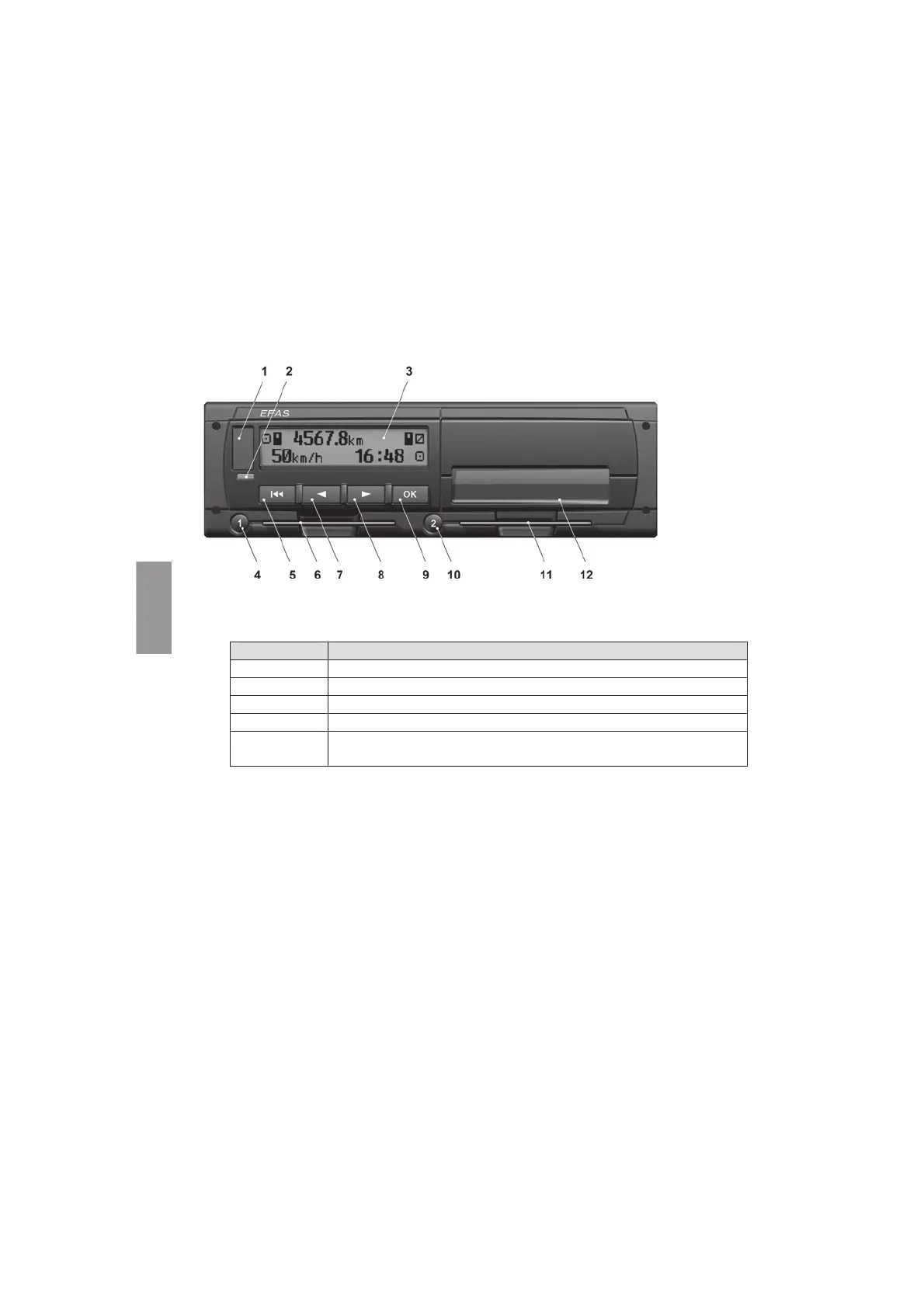 Az EFAS digitális tachográf a következĘ kijelzĘ és kezelĘ elemekkel rendelkezik: